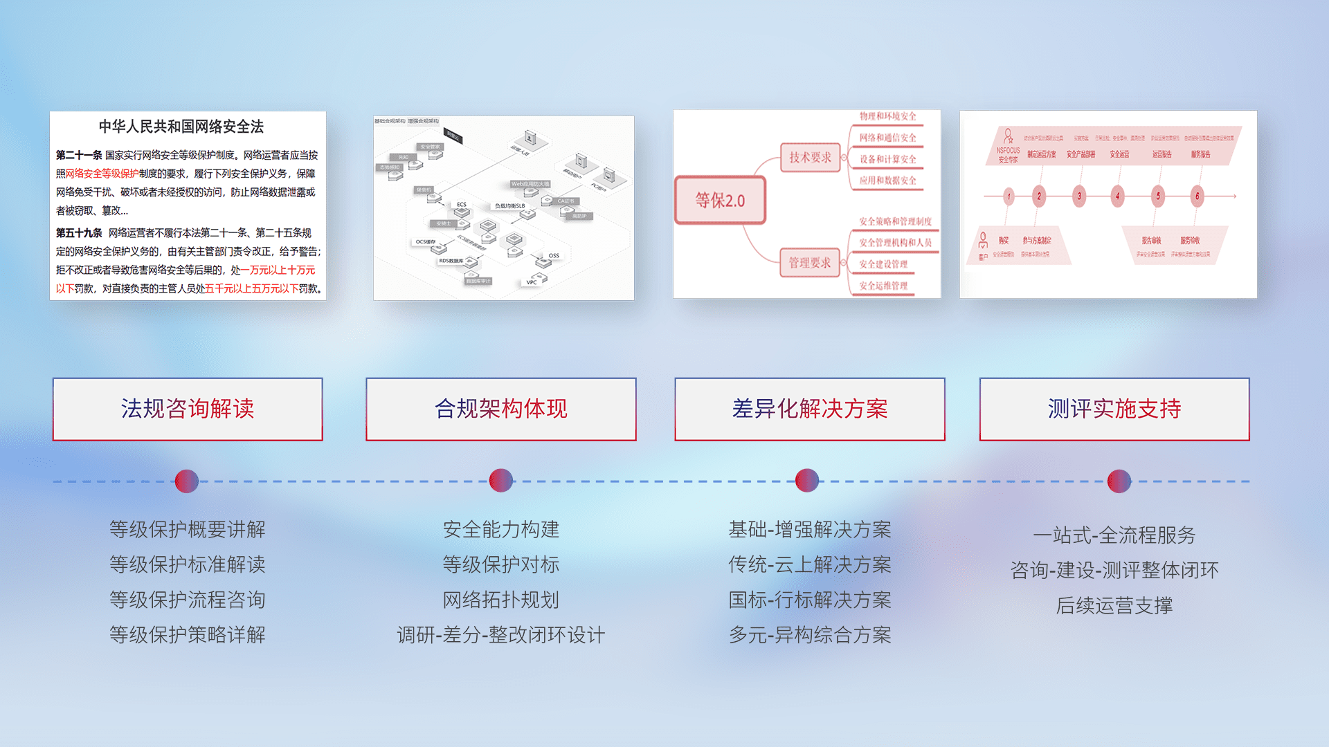 通过专业的法律咨询解读、、、、合规架构体现、、、、差异化解决方案、、测试实施支持等服务,,为客户量身打造等保合规体系。。。